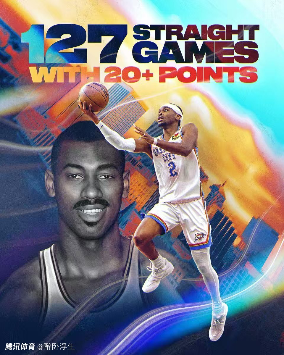 亚历山大连续127场得分20+,超越张伯伦保持63年的纪录,正式超越独占NBA历史第一纪录。