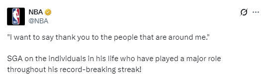 亚历山大还感谢了在此期间一直支持他的人,他说道:“说实话,一切都完全不一样了。我从一个篮球运动员,到如今看着我的儿子在这段时间里成长了这么多,还有这么多纪念日。一年半的时间里发生了太多事。我只想对身边的人说声谢谢。那些每天都见到我、和我一同成长、帮我享受生活、感受快乐的人。人们总说,当你做着自己热爱的事并乐在其中时,它就不会像是工作,你也能从中收获最多。这就是人生。”