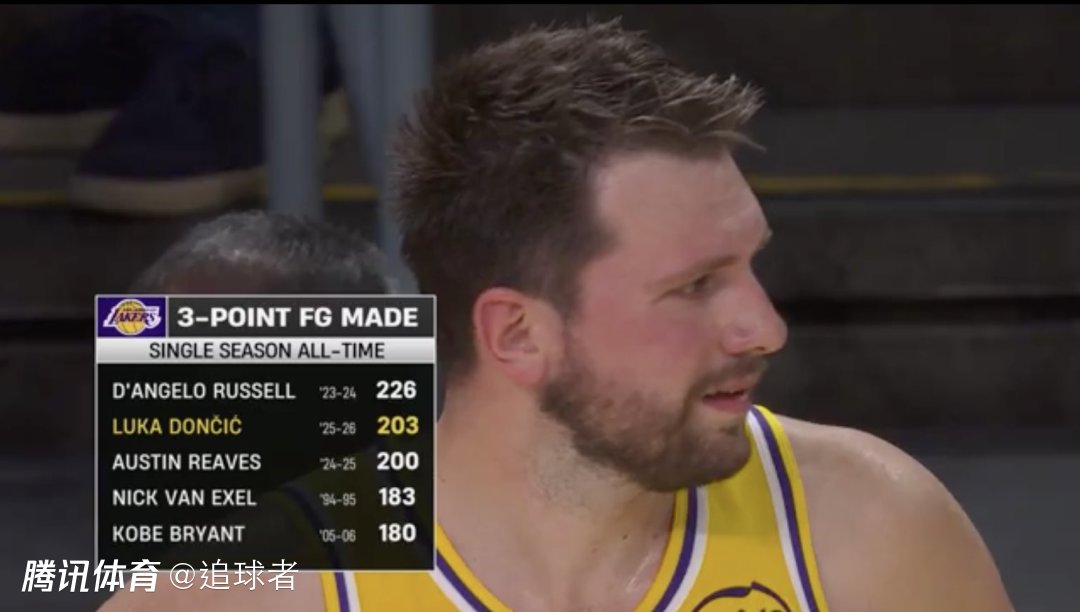 2、东契奇本赛季已经命中208记三分,超越里夫斯升到队史第二位,拉塞尔单赛季226记三分排在湖人队史第一