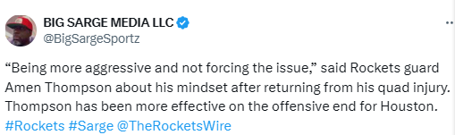 2026-03-14 06:30北京时间3月14日,火箭球员阿门-汤普森在球队训练结束后接受媒体采访,谈到自己从股四头肌伤病复出后的心态。