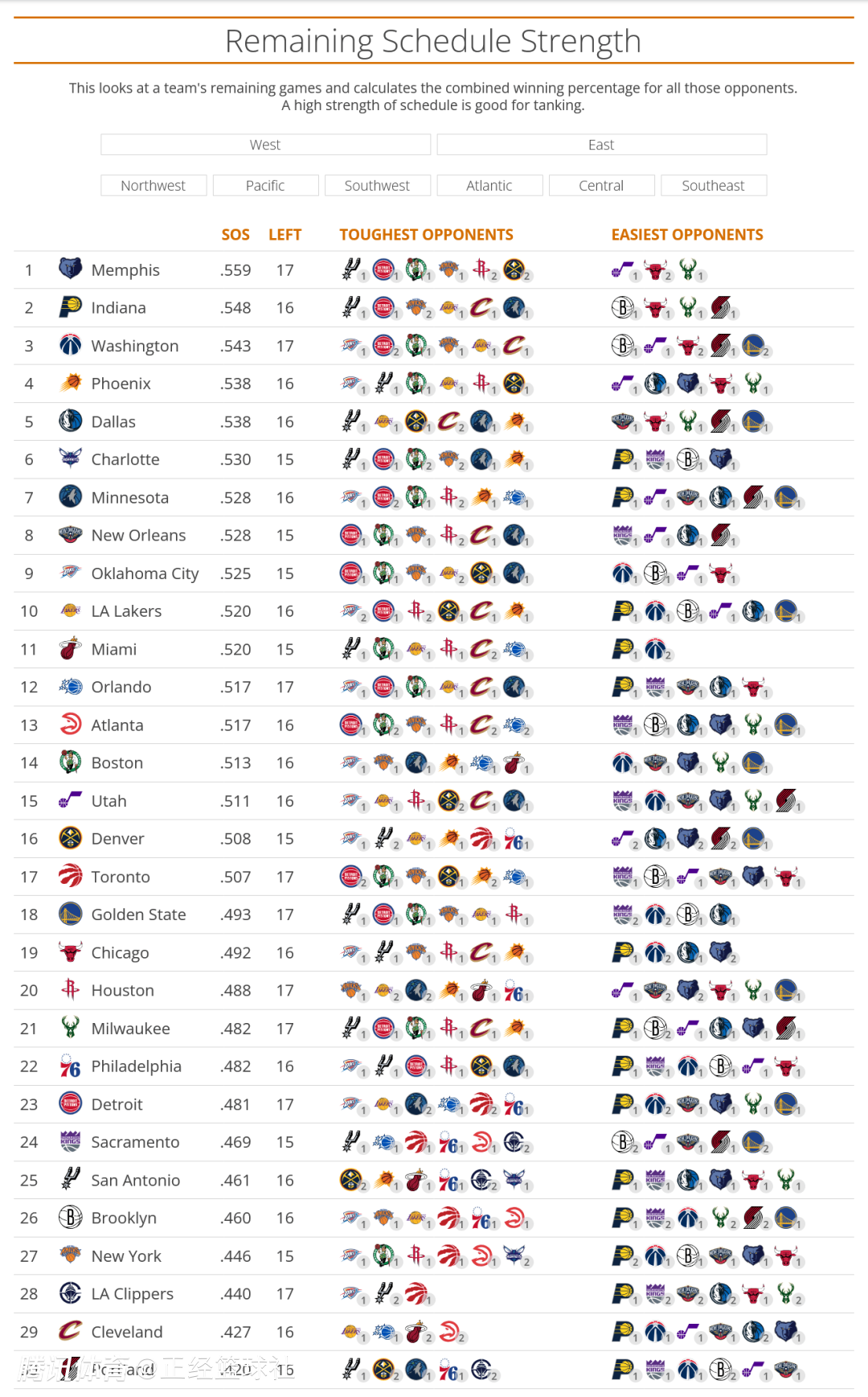 在赛程最轻松的梯队中,开拓者以0.420的 SOS 垫底,剩余16场比赛的对手平均胜率不足五成,成为全联盟剩余赛程最容易的球队,如今他们身处附加赛区,这很可能成为他们冲击季后赛的优势。