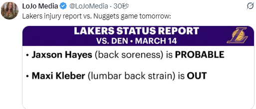 2026-03-14 08:30北京时间3月14日,湖人队官方公布了明日对阵掘金队的伤病报告,其中克勒贝尔缺席比赛,海斯大概率出战,具体情况如下: