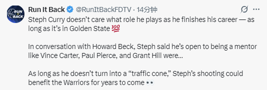 2026-03-14 09:30北京时间3月14日,根据NBA记者Howard Beck报道,他与勇士球星斯蒂芬-库里进行过交流,库里表示自己想在勇士结束职业生涯,可以接受当角色球员甚至打替补,想要像希尔、卡特和皮尔斯生涯末期时那样,成为球员兼导师。