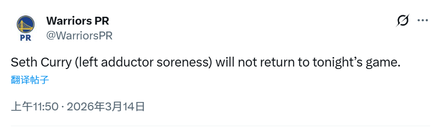 2026-03-14 12:10北京时间3月14日,NBA常规赛继续进行,勇士队对阵森林狼队。本场比赛进行到第三节,勇士队官方宣布,塞斯-库里因左内收肌酸痛,本场比赛将不会回归。