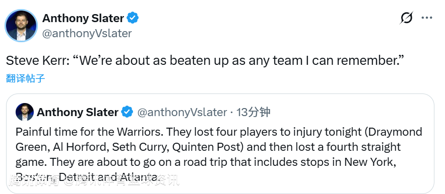 波斯特和小库里目前暂无最新伤情,科尔还称霍福德的小腿伤势为肌肉拉伤。