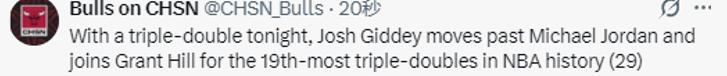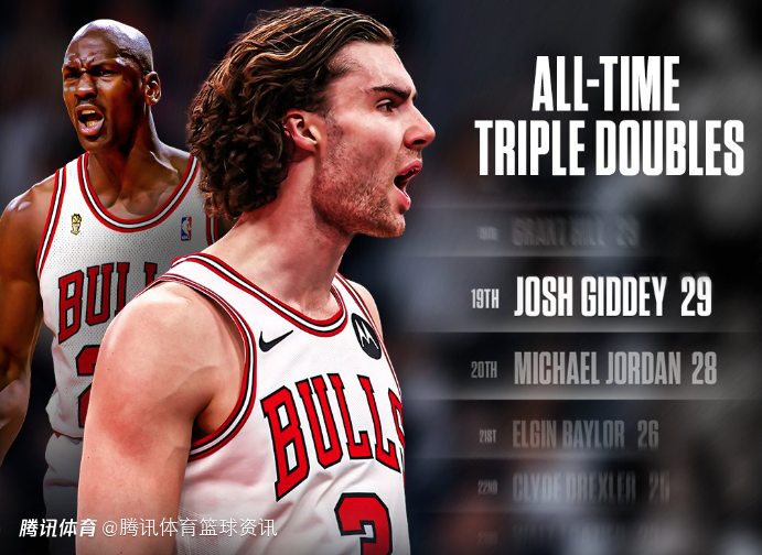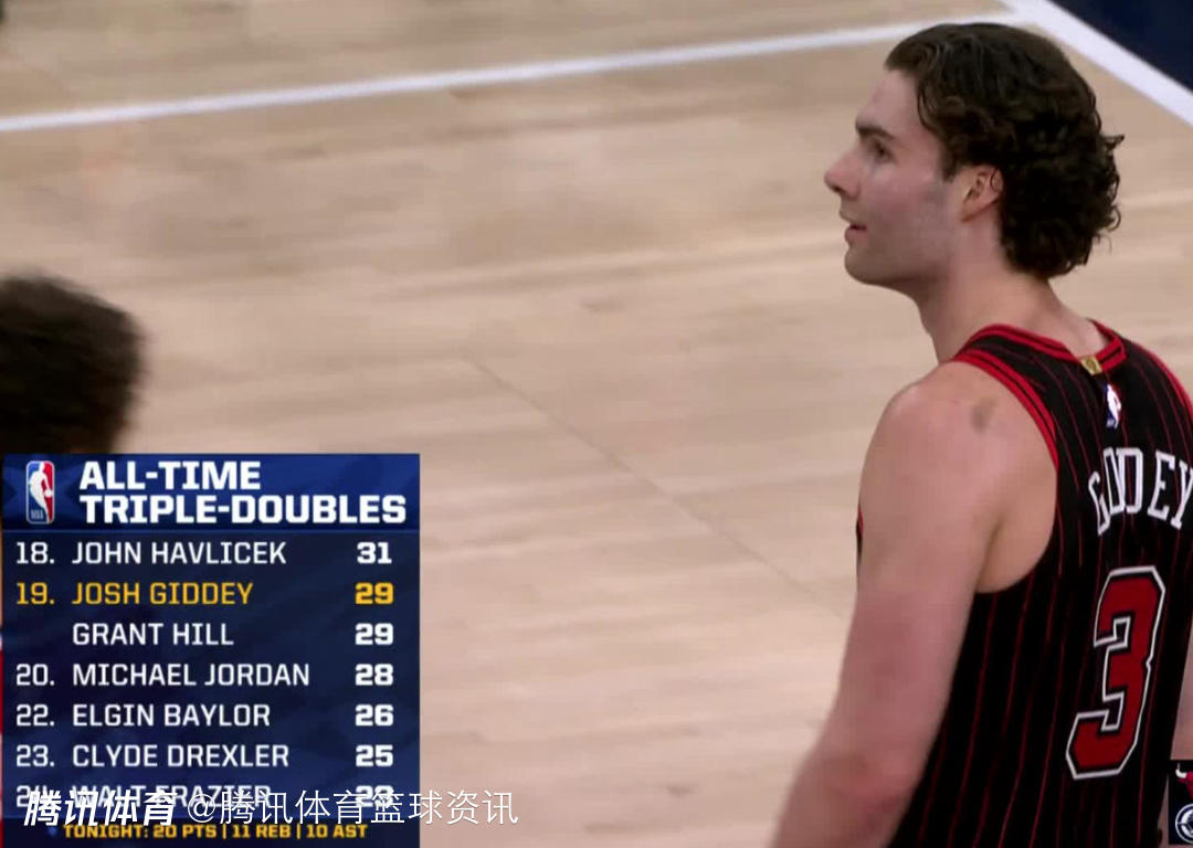 根据数据统计显示,这是约什-吉迪职业生涯第29次砍下三双,他超越了迈克尔-乔丹,追平了格兰特-希尔,并列排在NBA历史三双榜第19位。目前在吉迪身前的球员是哈弗里切克,他职业生涯总计获得过31次三双。