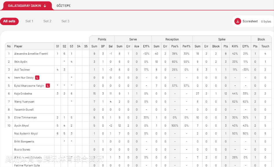 本场比赛中,加拉塔萨雷队格罗贝尔纳得到15分,弗兰蒂得到9分,中国球员王媛媛第三局替补出场,得到本队第三高的7分(8扣5中2拦)。