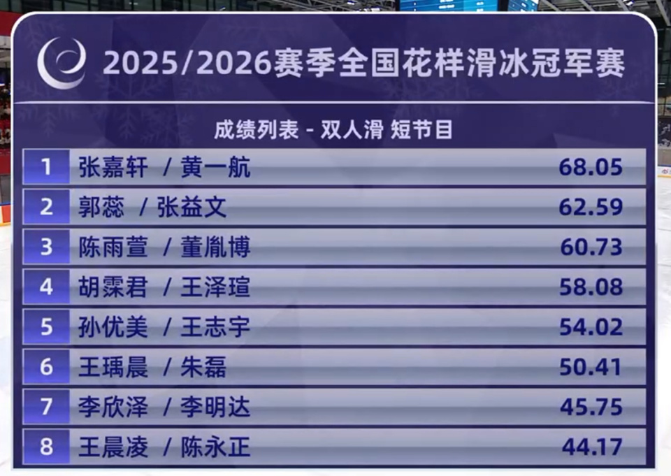 2026-03-14 20:50在刚刚结束的2026全国花样滑冰冠军赛双人短节目的比拼里,张嘉轩/黄一航以68.05排在第一;刚刚参加完世青赛的郭蕊/张益文和陈雨萱/董胤博分列二三位。