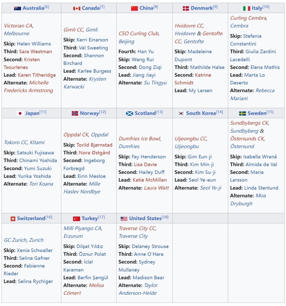 不过,因为对于相当一部分协会来说,冬奥会和世锦赛是两场不同的选拔赛,因此加拿大、日本、苏格兰(英国)、瑞典、瑞士、美国这六支队伍都是没有参加冬奥会,但世锦赛选拔胜出的队伍。