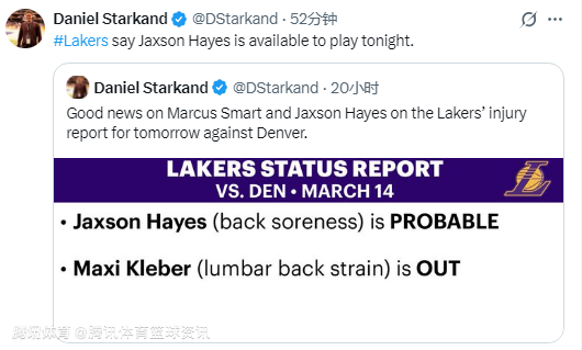2026-03-15 05:20北京时间3月15日,NBA常规赛继续进行,湖人对阵掘金。赛前,湖人方面更新球队伤情报告,中锋海斯确定可以出战本场比赛。