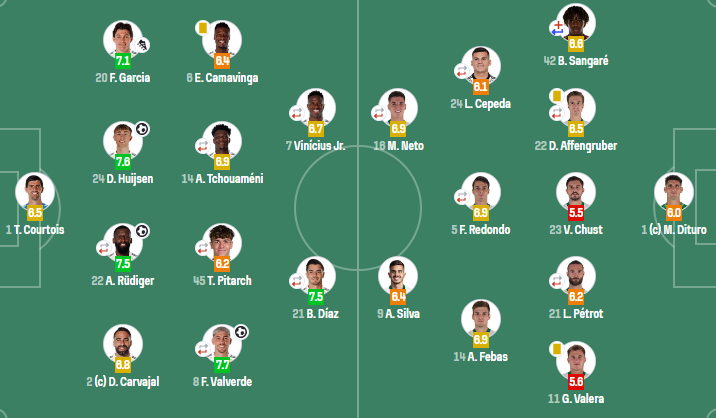 皇家马德里:库尔图瓦;卡瓦哈尔,吕迪格(61'迭戈-阿瓜多),赫伊森,弗兰-加西亚;巴尔韦德(58'居莱尔),皮塔奇(63'塞萨尔-帕拉西奥斯),琼阿梅尼(58'丹尼尔-亚涅斯),卡马文加;布拉欣-迪亚斯(63'曼努埃尔-安赫尔),维尼修斯(58'贡萨洛-加西亚)