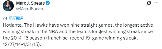 根据数据统计显示,老鹰豪取九连胜,这是目前NBA现存最长连胜,也是球队自2014-15赛季以来的最长连胜(2014-15赛季曾创下队史纪录19连胜,时间为2014年12月28日 —2015年2月1日)。