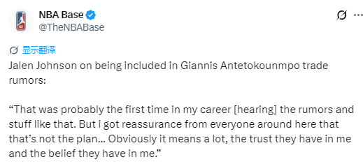 2026-03-15 08:00北京时间3月15日,据名记Jake Fischer报道,老鹰球星杰伦-约翰逊在谈到自己卷入字母哥交易流言时表示,他从球队得到保证并无交易意向。