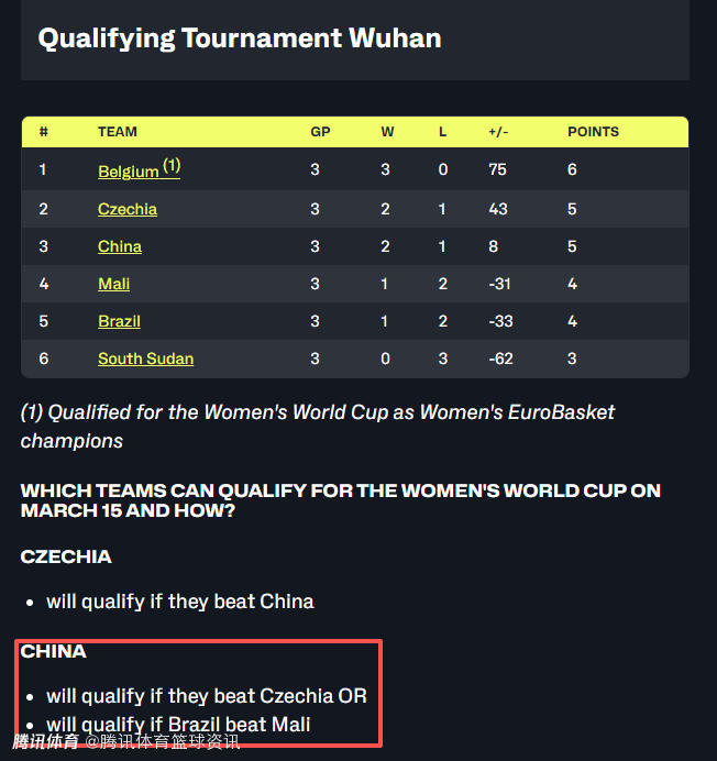 根据女篮世预赛的规则,武汉赛区的前3名可以获得直接晋级世界杯的资格(比利时女篮作为洲际冠军队已提前获得参赛资格,不占据武汉赛区的出线名额)。中国女篮在前3场小组赛结束后取得2胜1负的战绩,暂时排在小组第3位,但她们与第2名的捷克女篮战绩相同,只是净胜分少于对手,所以排名靠后。