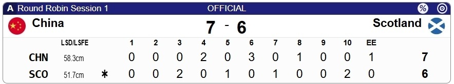 LSD投掷,中国投出58.3,苏格兰队则是51.7,抢到了开局后手。