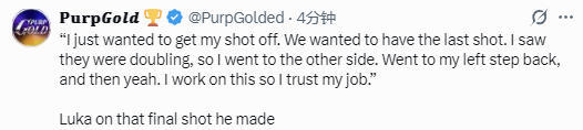 在谈到最后一攻的情况时,东契奇表示:“最后一攻,我只是想摆脱防守。你也知道,谁都想投进最后一球。我当时看到了他们在包夹,觉得另一侧出现了机会,于是就走到了另一侧,用我的左侧后撤步出手。这个动作我一直在练,所以我相信自己的出手。”
