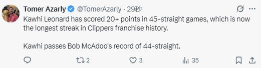 根据数据统计显示,莱昂纳德已经连续45场比赛得分20+,这一成就目前成为快船队史最长纪录,他成功超越了鲍勃-麦卡杜所保持的连续44场20+纪录(上一场比赛莱昂纳德追平了麦卡杜的纪录)。