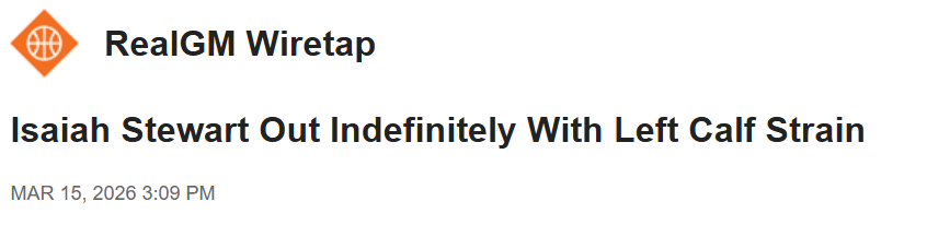 2026-03-16 07:50北京时间3月16日,据队记Omari Sankofa II报道,活塞近期已经有过在以赛亚-斯图尔特缺阵的情况下打球的经历,而他们接下来还得继续依靠这套应对方式——斯图尔特因左侧小腿拉伤,将无限期缺阵。