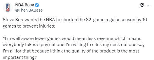 在谈到想让NBA缩减10场赛程的话题时,科尔说道:“我确实说过。我只是想把这个话题拿出来讨论。我觉得我们应该始终为联盟的产品提前考量。我深爱这个联盟,在联盟里待了大概35年。我们有非常出色的从业者,联盟的产品也很棒,但联盟变化太快,球员的比赛强度要求极高,我们也看到了大量伤病出现。我觉得这个议题值得拿出来好好讨论。”