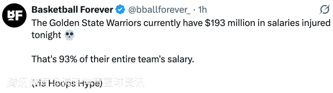 根据数据统计显示,勇士本场比赛缺席伤员总薪水已高达1.93亿美元,占全队工资的93%。