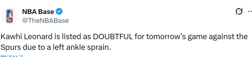 2026-03-16 08:40北京时间3月16日,NBA常规赛继续进行,快船明日对阵马刺。赛前,快船官方更新球队伤病情况,莱昂纳德因左脚踝扭伤被列为大概率缺阵。