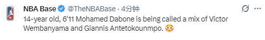 2026-03-16 12:40北京时间3月16日,篮球媒体rithmm晒出了一段巴萨小将穆罕默德-达博内的视频集锦,这位14岁的小将身高已经达到了6英尺11英寸(约2米11),被成为文班亚马和扬尼斯-阿德托昆博的结合体。