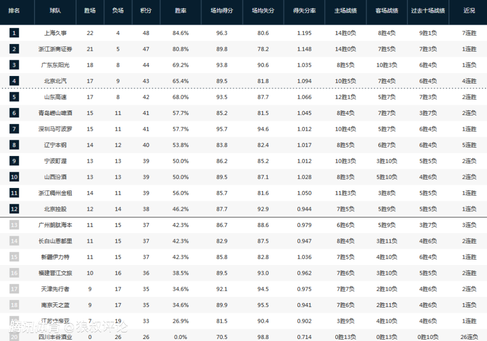 CBA最新排名:上海7连胜稳居领头羊 北京重返前4 四川26连败