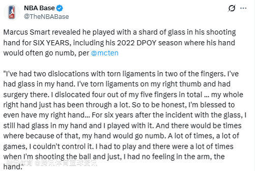 2026-03-16 22:50北京时间3月16日,湖人球员斯马特接受媒体采访,透露自己的投篮手内残留玻璃碎片长达6年,其中包括他斩获2022年最佳防守球员的那个赛季,那段时间他的手经常发麻。