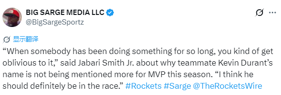 2026-03-17 06:20北京时间3月17日,火箭球星小贾巴里-史密斯在球队训练结束后接受媒体采访,谈及杜兰特是否应该进入MVP人选范围的话题。