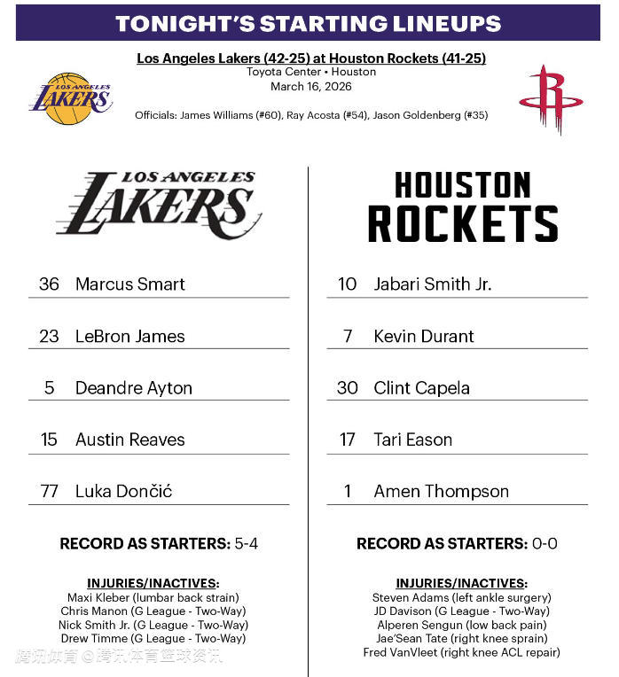 2026-03-17 09:20北京时间3月17日,NBA常规赛继续进行,火箭队对阵湖人队。赛前,双方公布了本场比赛的首发阵容,詹姆斯和杜兰特领衔出战,卡佩拉顶替申京出任首发中锋。