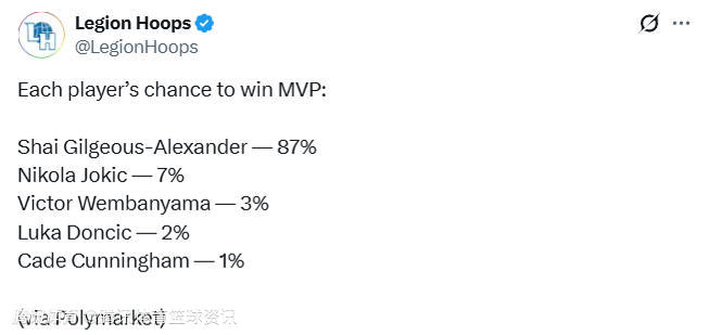 MVP获奖概率前5名为:亚历山大(87%)、约基奇(7%)、文班亚马(3%)、东契奇(2%)、坎宁安(1%)。