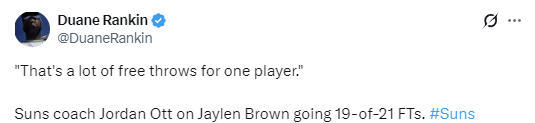 不过需要注意的是,尽管布朗本场罚球21次,但两队的罚球总数其实相差无几。事实上,太阳的罚球次数比凯尔特人还多,太阳队总计29罚27中,凯尔特人队总计27罚25中。