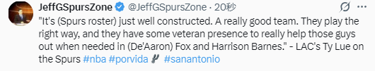 在谈到马刺队的表现时,卢说道:“这支马刺的阵容构建得非常好,是一支非常出色的球队。他们打球方式很正确,而且球队里有福克斯和哈里森-巴恩斯这样的老将,在需要的时候能很好地带动年轻球员。”