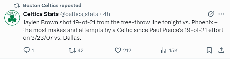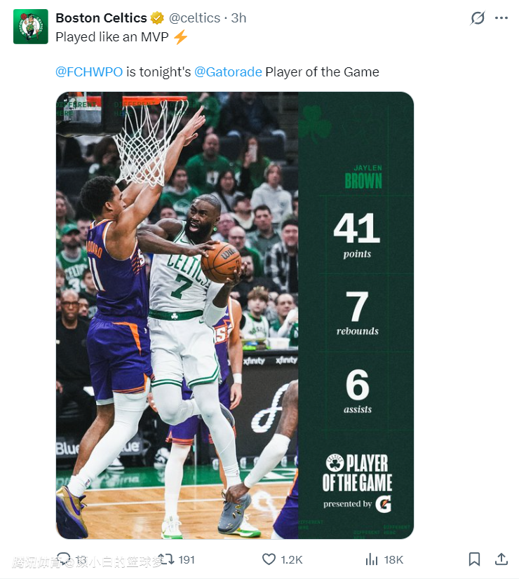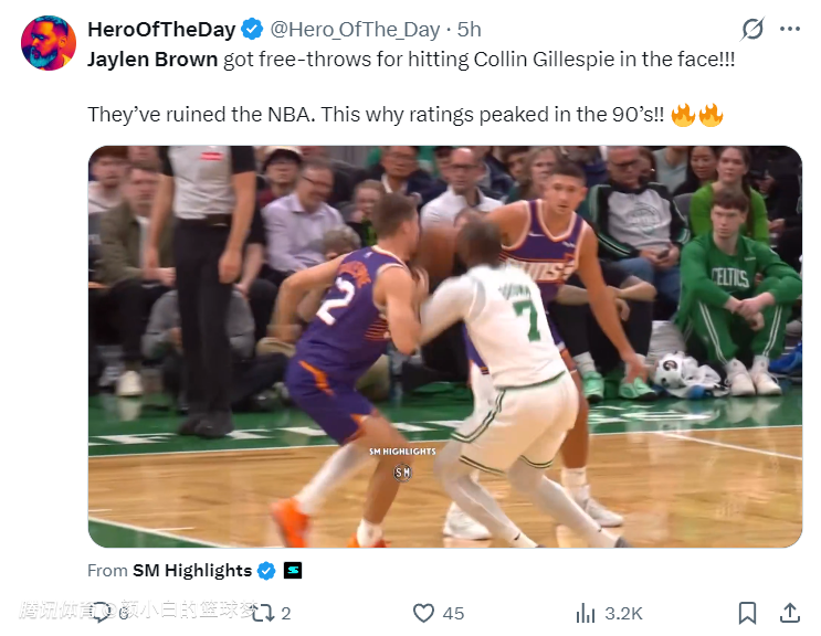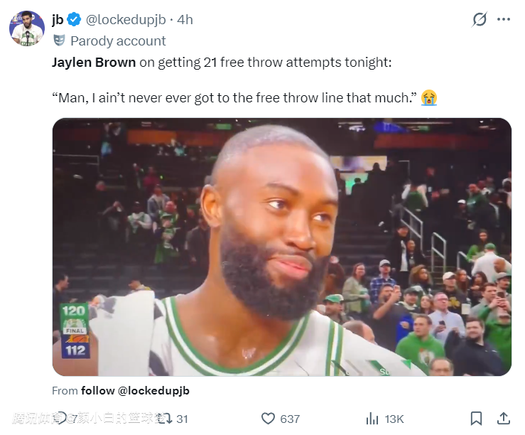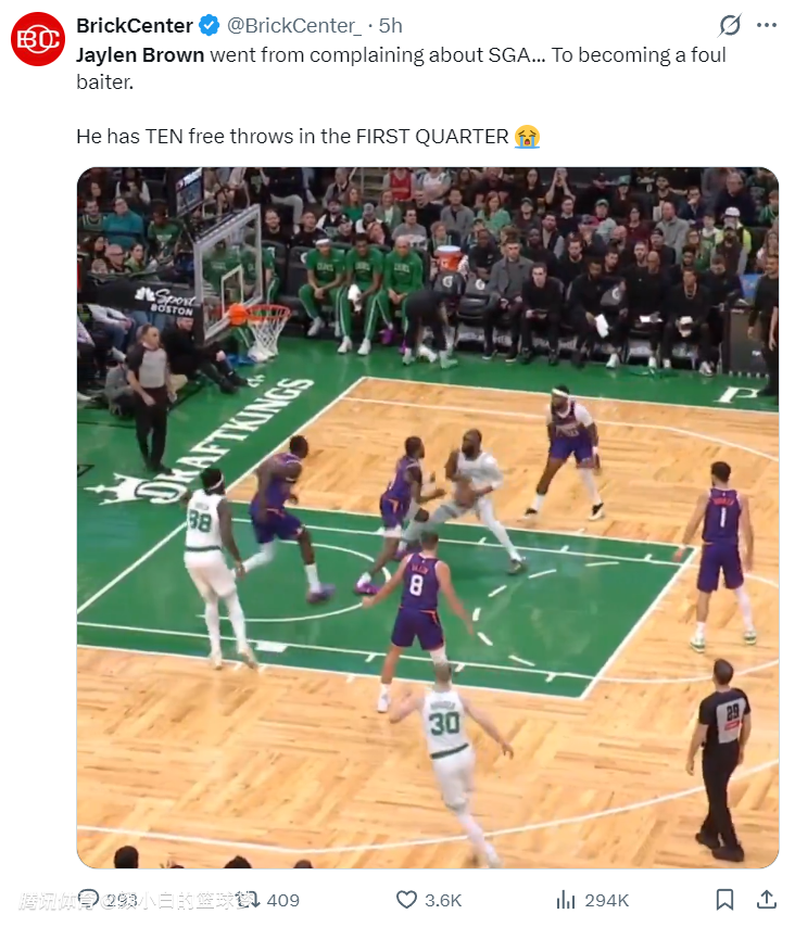 整个第四节就是布朗的舞台,12分钟里7中4,罚球10中10拿到18分4篮板1助攻1抢断1盖帽,但赛后也引发了热议。(首节10罚、末节10罚)