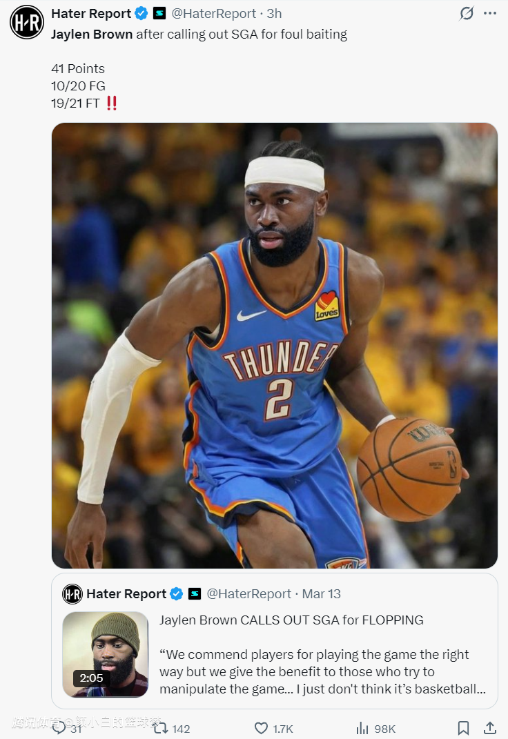 3月13日绿凯不敌雷霆的赛后,杰伦-布朗刚刚谈论过SGA造犯规的话题,他没有点名SGA,他是说:我们应该提倡球员们以正确的方式打球,而不是为了操纵比赛谋取红利占便宜,我认为那根本不是篮球,故意骗犯规的行为太拙劣。