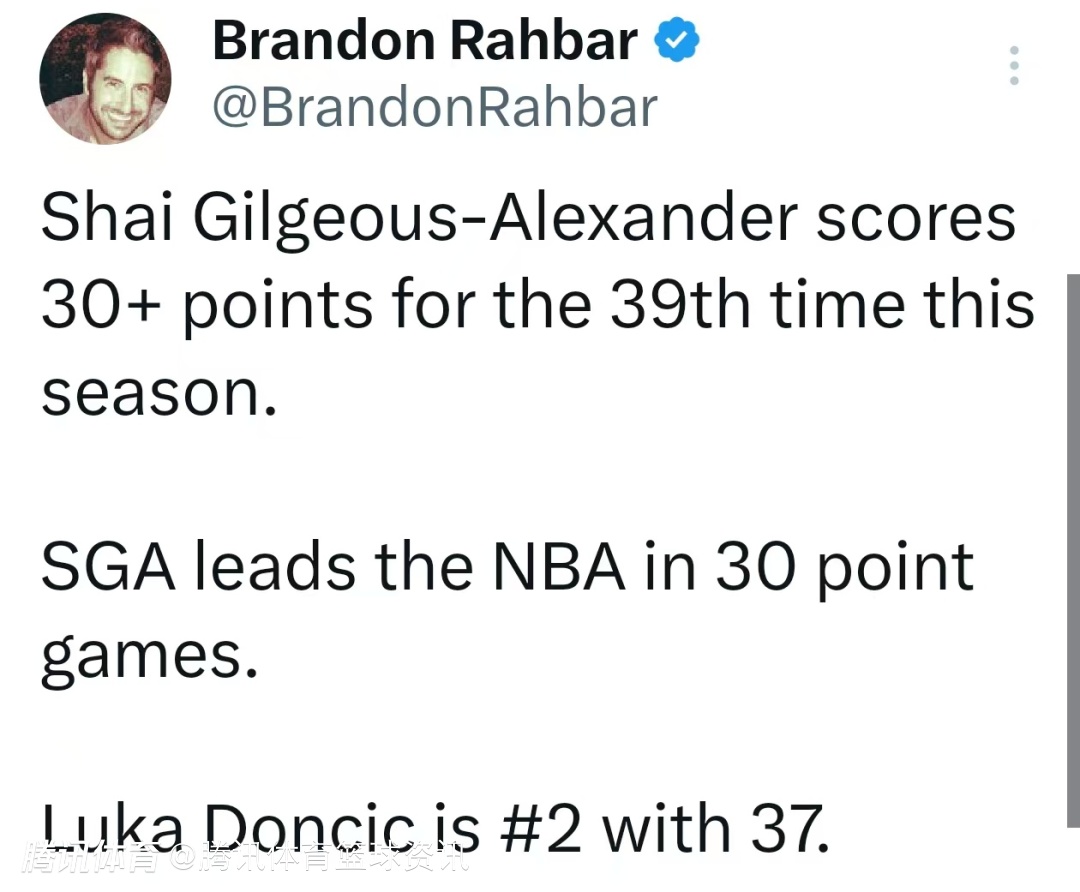 比赛进行至第三节还剩1分34秒时,亚历山大打成2+1,第三节单节轰下19分,全场总分来到31分,就此达成本赛季第39次砍下30+得分的纪录,排名联盟第一。东契奇以37次位列第二。