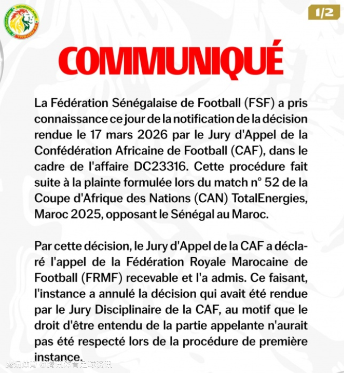 为维护自身权益及塞内加尔足球的利益,塞内加尔足协将尽快向体育仲裁法庭(CAS)提起上诉程序。