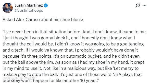 赛后谈到拿鞋盖帽一事,卡鲁索表示:我之前从未遇到过这种情况。而且,我不知道,它突然就发生了。我当时就想着要盖掉那个球;老实说,我不知道裁判会怎么判。我不知道那会是一个干扰球和一个技术犯规。如果早知道是这样,我可能就不会那么做了,因为那会丢掉三分。