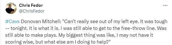 米切尔在本场比赛期间左眼曾被对手打到,而且明显可以看到他的眼球已经充血,在谈到此事时,米切尔说道:“我的左眼几乎看不清东西。今晚真的很难受,但也只能这样了。我还是能站上罚球线,也还是能打出表现。我最在意的是,就算我得分不在状态,我还能做些什么来帮助球队。”