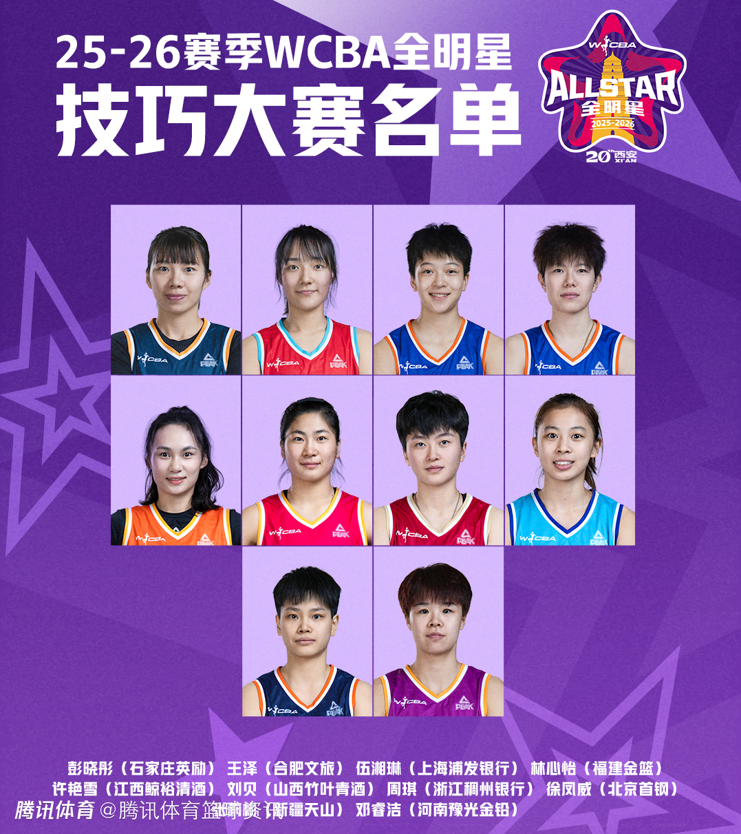 三分球大赛:丁奕可(武汉盛帆黄鹤)、谢泼德(厦门银行)、杨舒予(东莞新彤盛)、张瀞丹(江西鲸裕清酒)、董可尔(浙江稠州银行)、方卓雅(陕西榆林天泽)、赵雅琢(山东赤水河酒)、黄琨(江苏南钢)、周月明(河南豫光金铅)、王思雨(四川蜀道远达)。