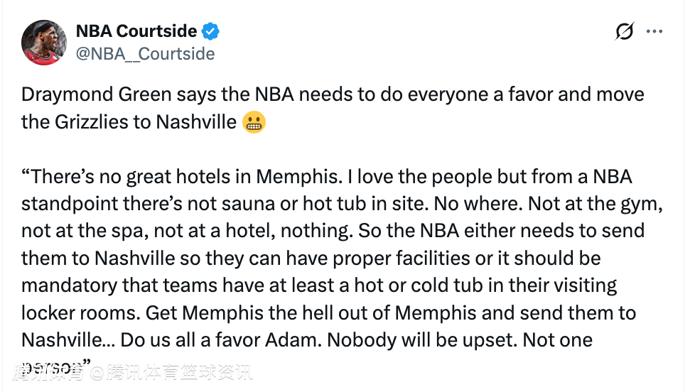 追梦表示:“孟菲斯根本没什么像样的酒店。我爱这里的人,但从NBA球员的角度来说,这里连个桑拿房或者热水浴缸都找不到——哪儿都没有。球馆里没有,水疗中心没有,酒店里也没有,啥都没有。”