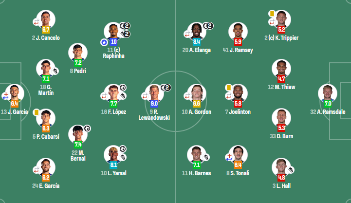 巴塞罗那:13-霍安-加西亚(82' 25-什琴斯尼);24-埃里克-加西亚(22' 4-阿劳霍),5-库巴西,18-赫拉德-马丁,2-坎塞洛(66' 42-埃斯帕特);22-贝尔纳尔,8-佩德里;10-亚马尔,16-费尔明(67' 20-奥尔莫),11-拉菲尼亚;19-莱万多夫斯基(66' 7-费兰)
