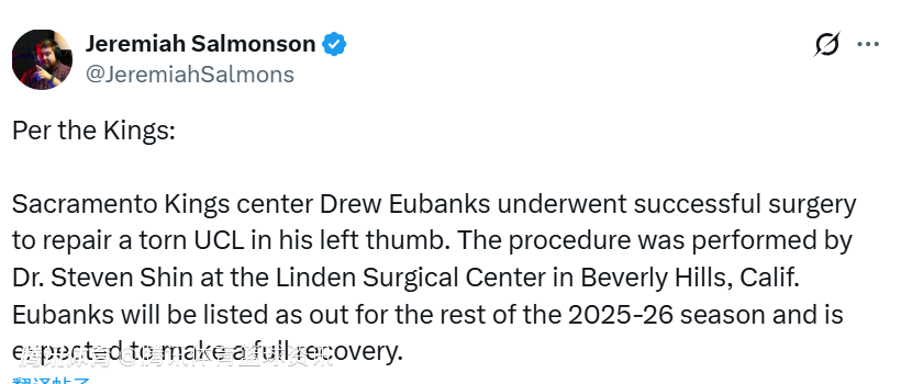 2026-03-19 08:10北京时间3月19日,据国王队记肖恩-坎宁安报道,尤班克斯已成功接受了左手拇指尺侧副韧带(UCL)撕裂修复手术,他将缺席本赛季剩余所有比赛。
