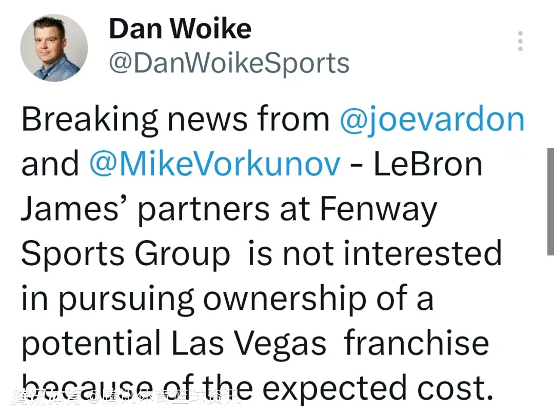 随着NBA下周将推进拉斯维加斯与西雅图的扩军计划,詹姆斯持续十年的梦想正逐渐落空。据两位知情人士透露,自2011年起与詹姆斯合作、拥有波士顿红袜与利物浦的芬威体育集团,目前无意竞购拉斯维加斯的NBA扩张球队。其中一位消息人士表示,这家全球体育投资公司退出的原因是预期成本过高——NBA扩张加盟费可能高达每支球队80亿美元。