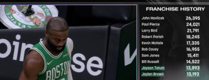 此役之前,杰伦-布朗职业生涯已经砍下13170分,首节比赛他独得19分,生涯总得分达到13189分,超越了Jojo-怀特,升至队史第11位。次节比赛,布朗再得4分,超越戴夫-考恩斯,升至队史得分榜第10位。