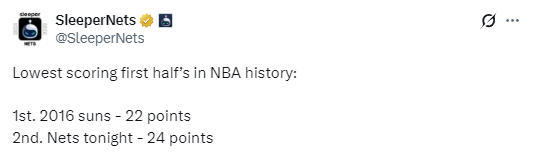 仅得24分!篮网创NBA历史上半场第二低分 还没雷霆单节得分高