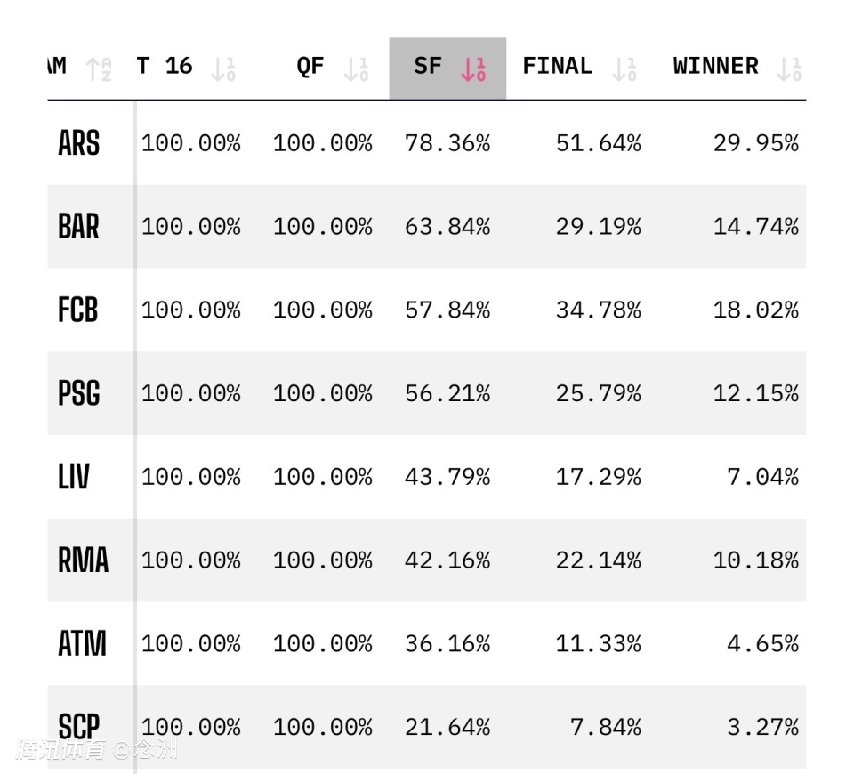 巴萨进入欧冠四强的几率高达63.48%,可见大数据是有多不看好马竞了。阿森纳则更轻松,淘汰葡萄牙体育的几率为78.36%。
