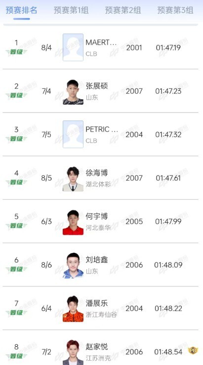 德国选手马腾斯1分47秒19排名预赛第1位,张展硕、佩特里克、徐海博、何宇博、刘培鑫、潘展乐和赵家悦8位选手,进入了晚间时段的A组决赛。