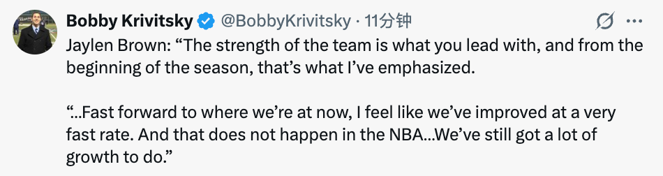 另外布朗也表示:“领导球队的核心是团队的力量,这是我从赛季初就一直强调的。如今再看,我觉得我们进步得非常快。这在NBA里并不常见…… 我们还有很大的成长空间。”