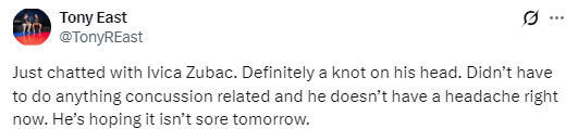 2026-03-19 11:50北京时间3月19日,NBA常规赛继续进行,步行者队119-127不敌开拓者队。祖巴茨此役出战23分钟,得到18分8篮板3助攻1盖帽。在比赛中,祖巴茨在一次防守克林根的空接时被后者用肘子打到了头部,导致他头部肿出一个包,提前退赛。赛后,祖巴茨谈到了自己的头部伤势。